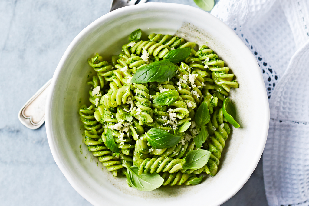 - Once combined, pop your pesto pasta into a bowl and top with more basil leaves, finely chopped walnuts and a shaving of parmesan if you’re using. Enjoy!